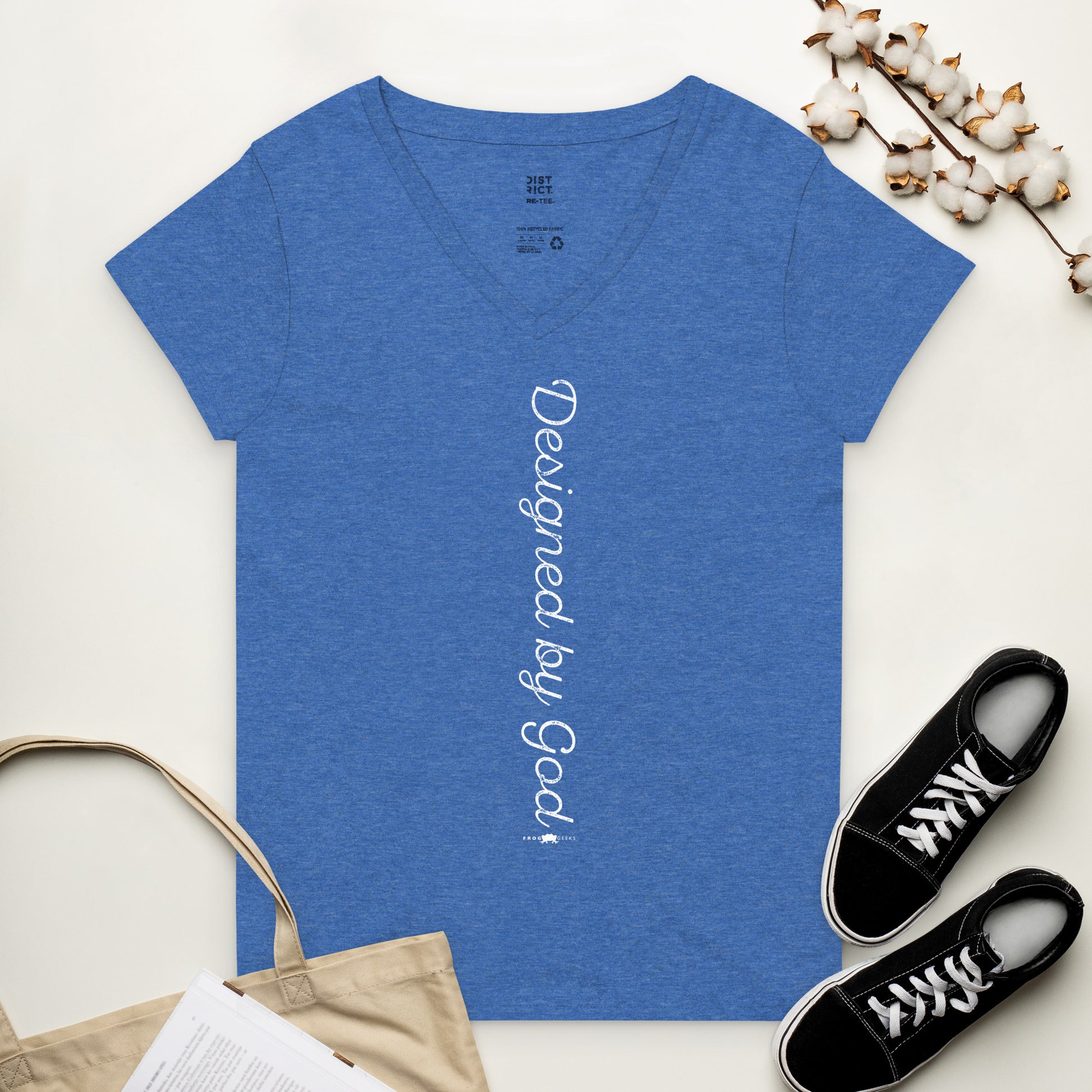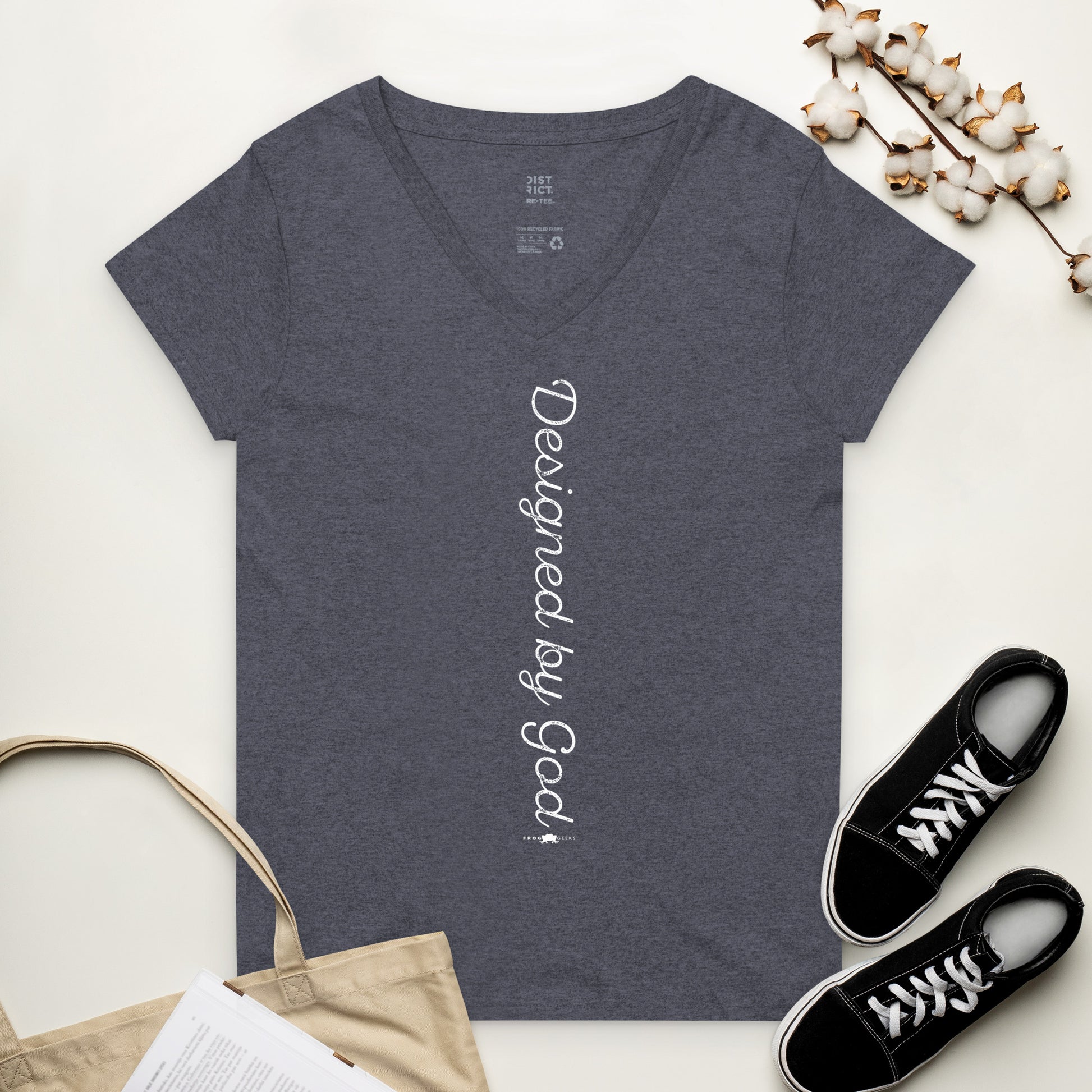 Women’s recycled v-neck t-shirt Designed by God by Frog Geeks