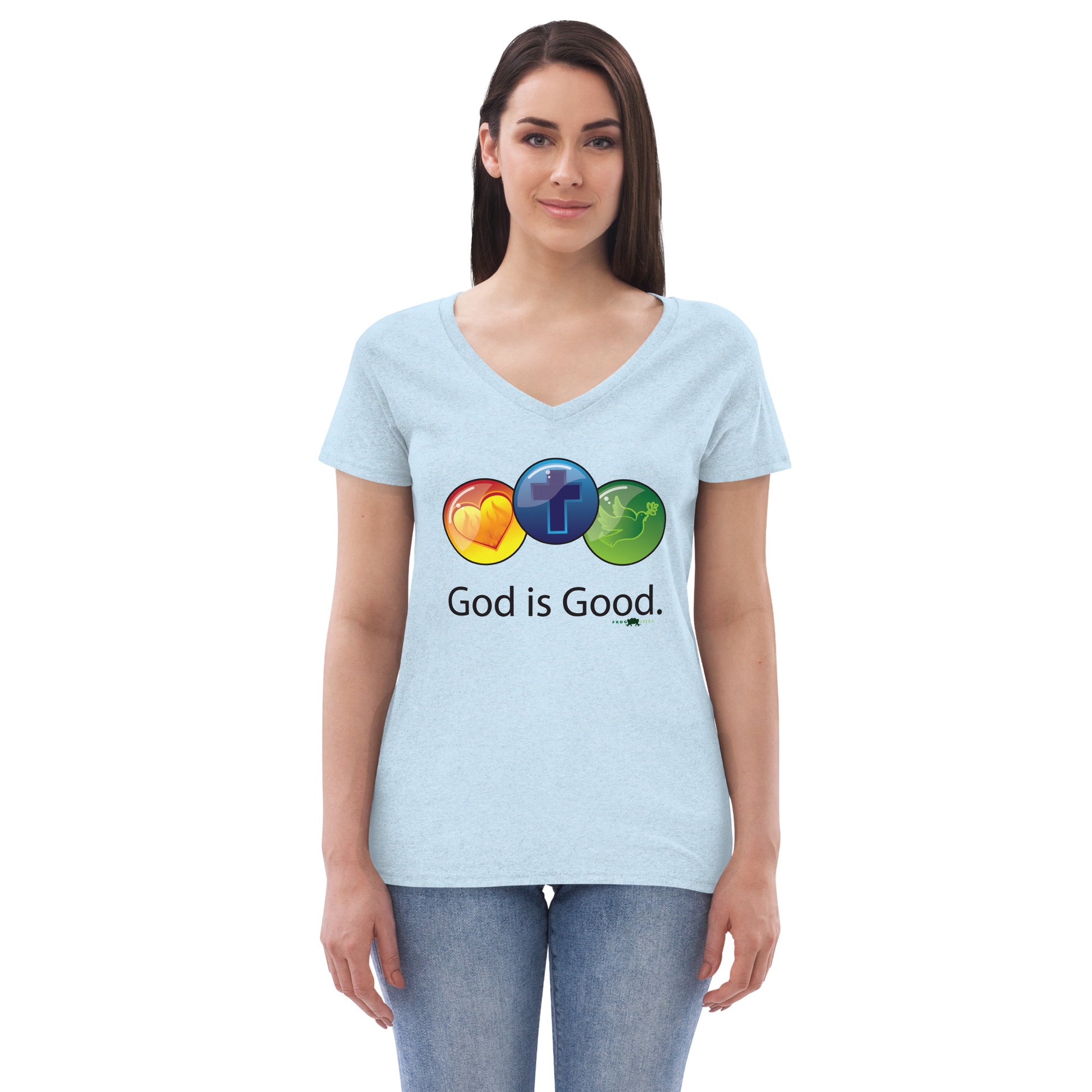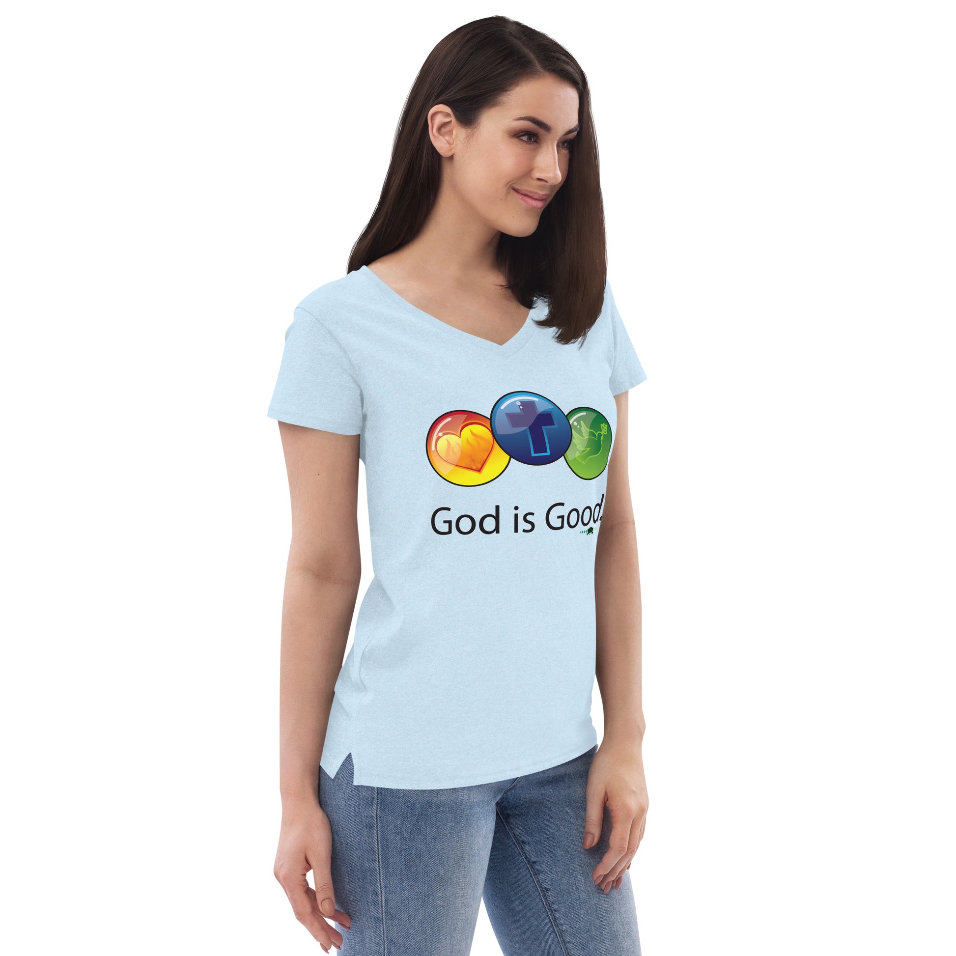 Women’s recycled v-neck t-shirt - God is Good by Frog Geeks